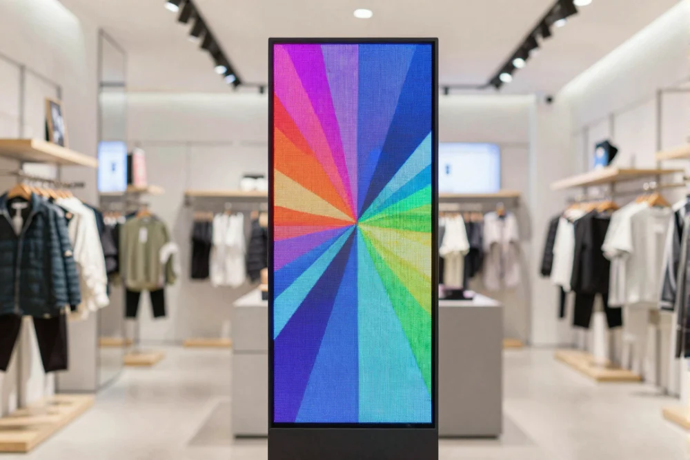 A sleek digital LED display standing in a contemporary retail space showing vibrant abstract visuals