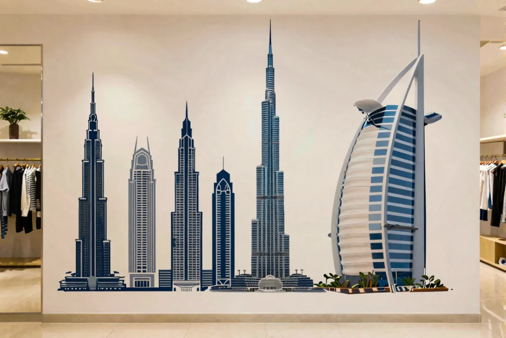 Custom wall graphics featuring local landmarks create a unique and engaging atmosphere in a Dubai retail store